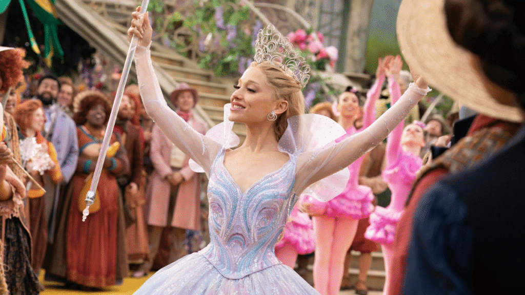 Em contrapartida, na Cidade das Esmeraldas, vemos a popular Glinda (Ariana Grande) rendida aos luxos e rodeada pela sua legião de adoradores se preparando para a inauguração da estrada de tijolos amarelos e para o anúncio surpresa de seu noivado com o recém nomeado capitão da Guarda dos Ventos, Fiyero (Jonathan Bailey). Contudo, antes dessa aparição pública acontecer, Madame Morrible (Michelle Yeoh) a presenteia com a tão almejada varinha de condão e seu mais novo meio de transporte – a bolha – precedida pelo conhecido jogo político e discurso manipulador que diz que o povo precisa acreditar que Elphaba não é a única bruxa capaz de voar pelos céus de Oz.